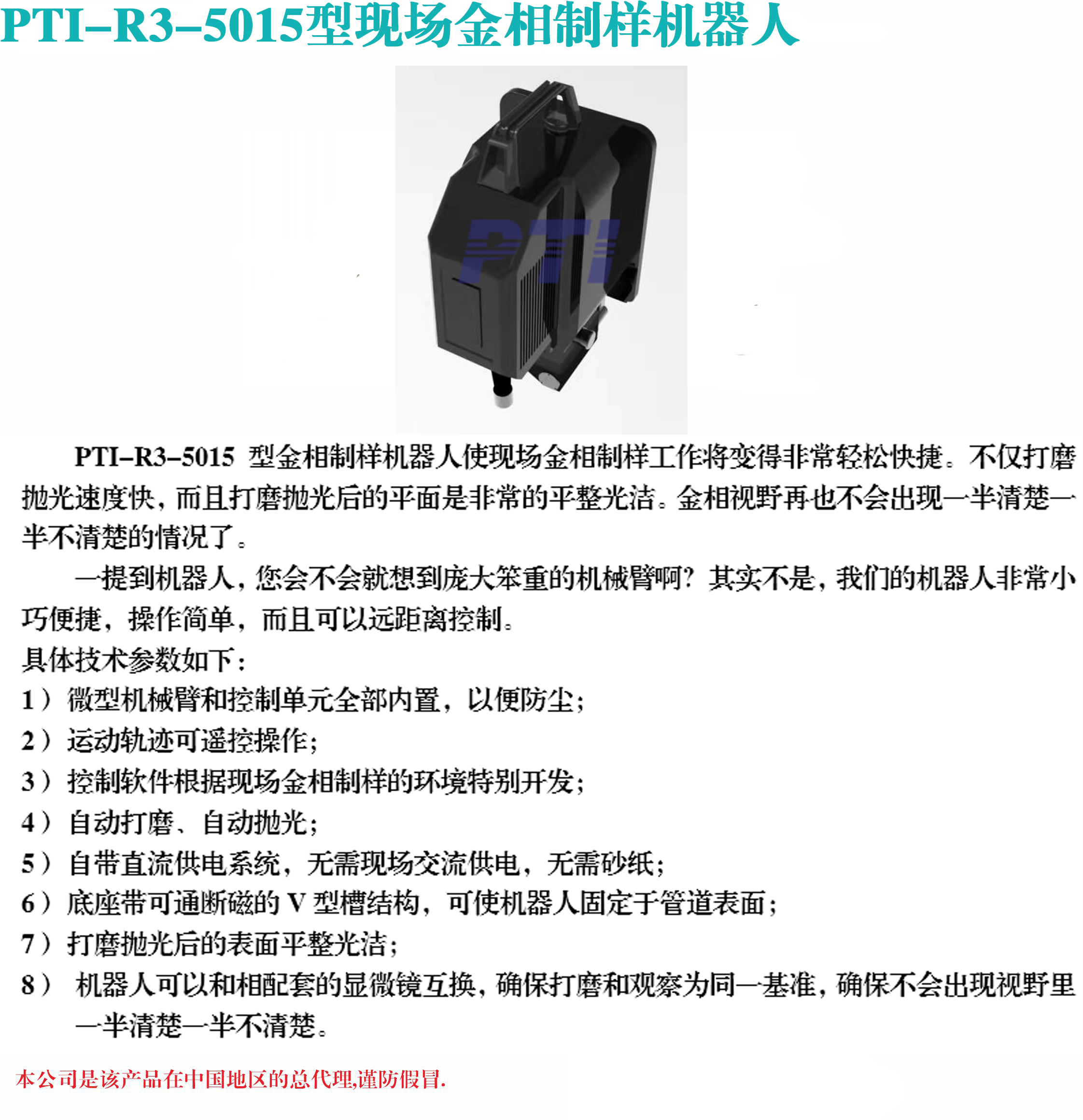 PTI-R3-5015型金相制樣機器人使現(xiàn)場金相制樣工作將變得非常輕松快捷。不僅打磨拋光速度快,而且打磨拋光后的平面是非常的平整光潔。金相視野再也不會出現(xiàn)一半清楚一半不清楚的情況了。